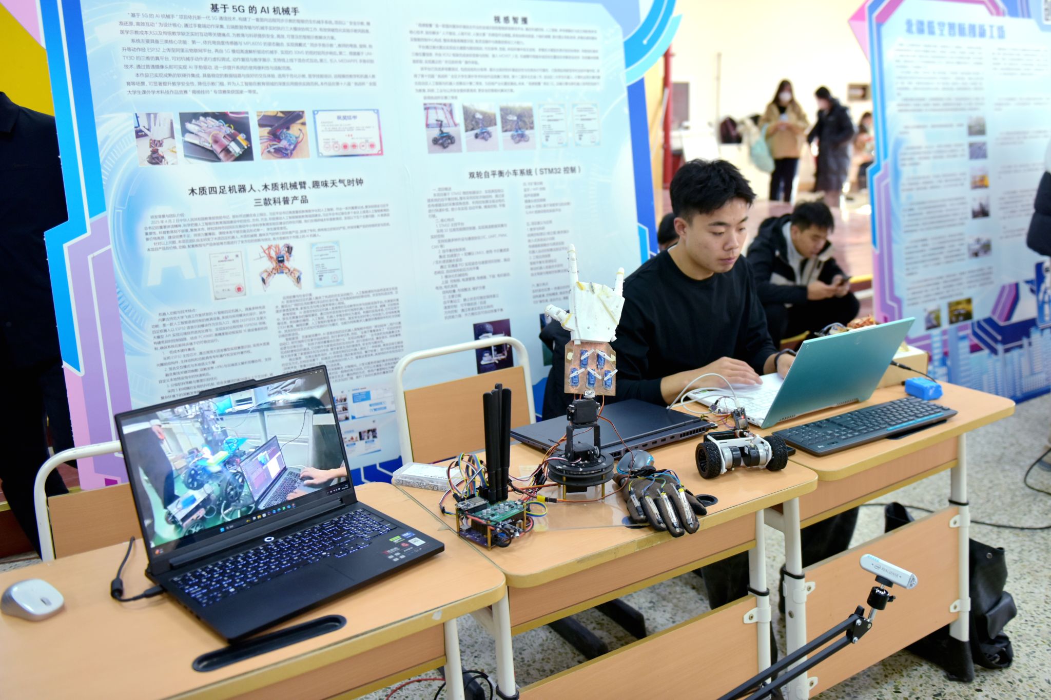 活動現場,各類 AI 創新作品亮點紛呈。在應用展示區,各團隊分別展示并講解了仿生機器人、四足仿生機器人(機器狗)、輪腿自平衡機器人、無人機、“基于5G的AI機械手”等作品,直觀呈現了技術成果和人工智能的應用前景。在AI心理咨詢展位,同學們通過AI學工智能交互系統體驗心理測評與疏導服務,感受科技賦能心理健康教育的溫暖力量。在AI信息素養展區,智能檢索、數據可視化等技術應用演示,展示了人工智能在提升學習效率方面的應用價值。
