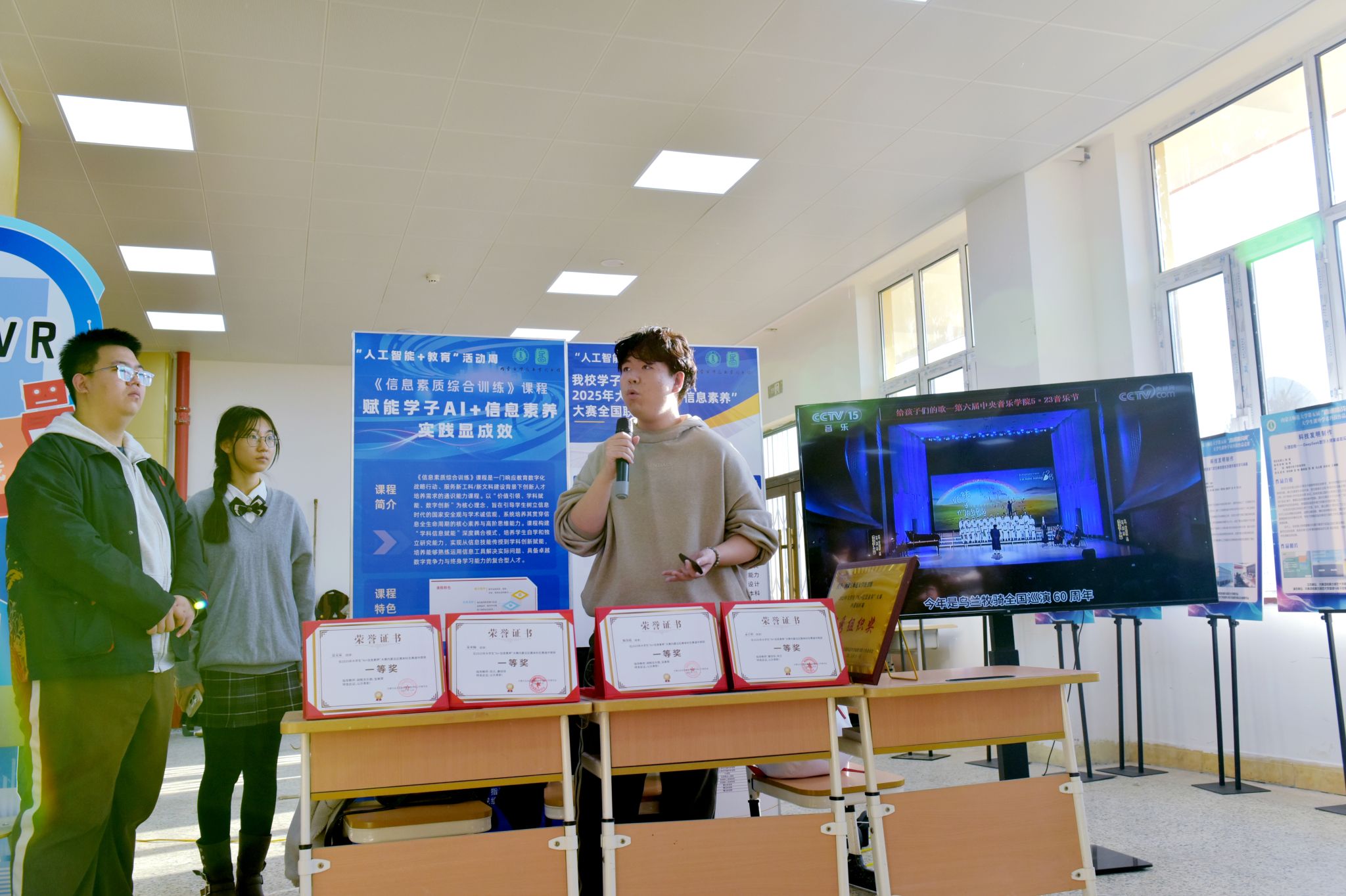 在競賽成果展區,“AI遺旅逸游·格斯爾史詩引擎”“美岱召:三娘子的繁花文化繪卷——用AIGC+文旅助力傳播北疆文化印記”等學校首屆“AI+文旅”創意設計大賽優秀作品,體現了AI技術賦能文旅產業的成效。“AI+信息素養大賽”優秀作品的展示,體現了大學生在AI技術賦能下信息處理與創新應用能力的提升?!疤魬鸨贝髮W生課外學術科技作品競賽科技發明作品展區集中展示了我校學生在科技創新領域的創新成果。