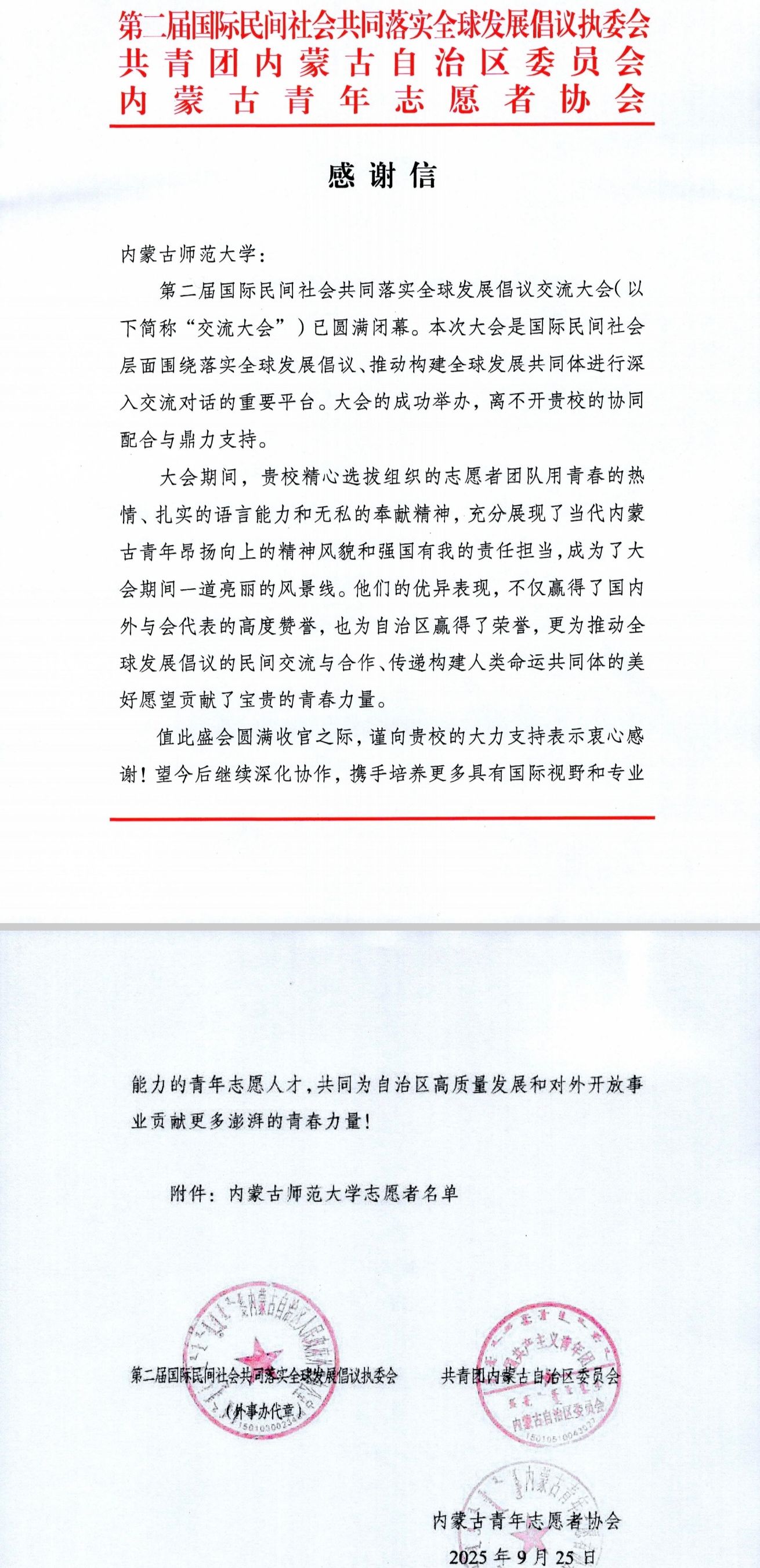 9月9日至11日,第二屆國(guó)際民間社會(huì)共同落實(shí)全球發(fā)展倡議交流大會(huì)在呼和浩特市召開(kāi)。內(nèi)蒙古師范大學(xué)外國(guó)語(yǔ)學(xué)院英語(yǔ)系選派了14名師生參與大會(huì)志愿服務(wù)。大會(huì)期間,志愿者們以高度的責(zé)任感和專(zhuān)業(yè)的服務(wù)水準(zhǔn),承擔(dān)了來(lái)賓引導(dǎo)接待、會(huì)議現(xiàn)場(chǎng)服務(wù)、多語(yǔ)種翻譯支持等環(huán)節(jié)工作,有力支持了大會(huì)各項(xiàng)議程的順利進(jìn)行,贏得了國(guó)內(nèi)外與會(huì)代表的廣泛贊譽(yù)。
